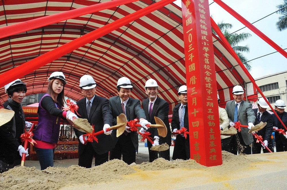 市長朱立倫日前出席主持板橋國小老舊校舍整建第2期工程動土典禮,朱立倫指出,雖然預算有限,但市府仍會盡全力推動老校更新,也感謝議會大力支持。
