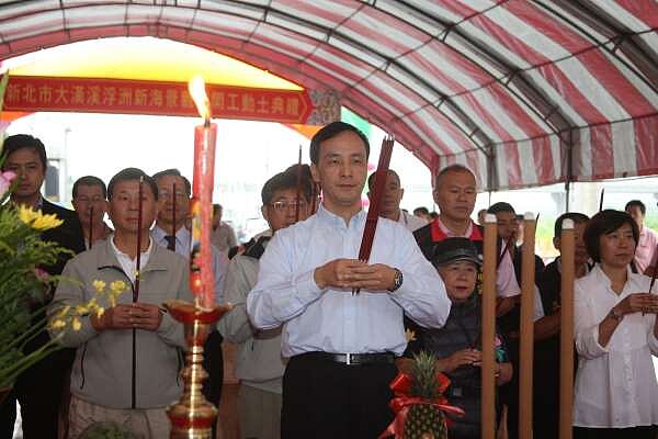 市長朱立倫28日親自出席在新莊區利濟橫移門外堤外停車場,舉行的「大漢溪浮洲新海景觀橋新建暨河岸景觀改善工程」動土典禮,市議員黃林玲玲、新莊區長許炳崑、板橋區長林純秀及多位里長等到場參加祝禱儀式,共同期許完成後的新橋,可以拉近河兩岸板橋435特區及新莊老街,形成新北新景點。