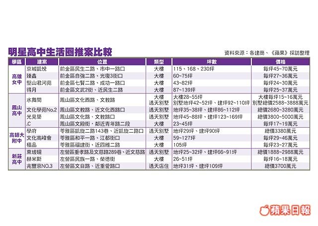 高雄市仲介公會副理事長鄭啟峰表示,明星高中生活圈因為12年國教實施變得熱門,但免試入學名額少,「許多家長反而會選擇學校評價次優的學區,如鳳山的鳳山高中及左營的新莊高中,入學機率高,房價也較市區便宜。」