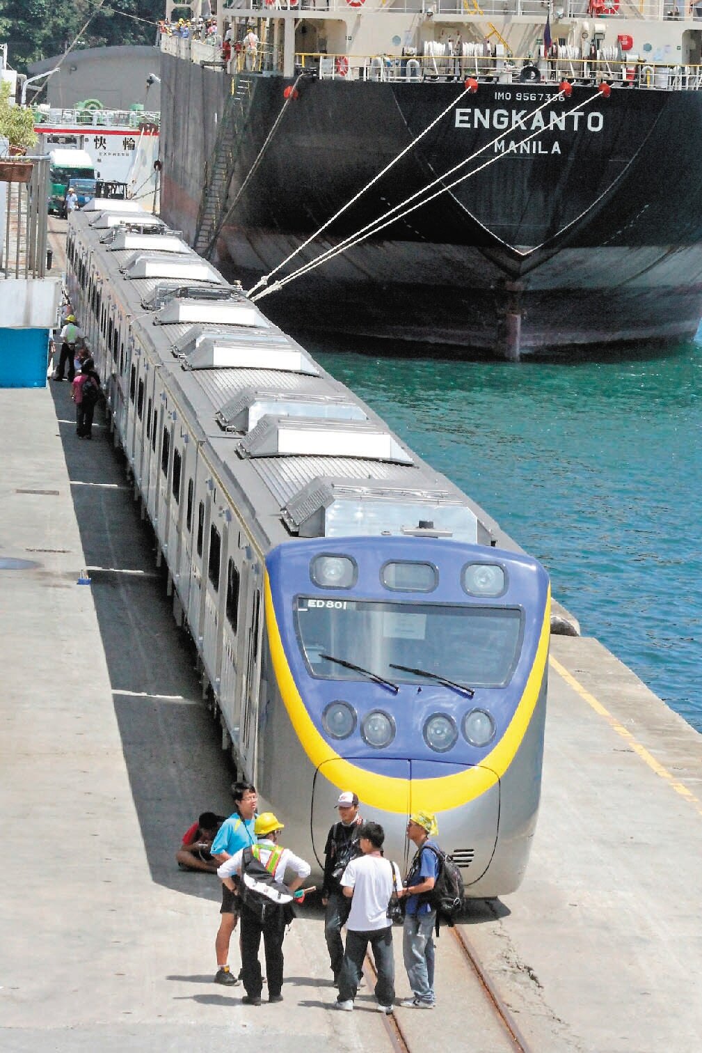 台鐵EMU800型通勤電聯車,昨天首批抵達基隆港。(記者牟玉珮/攝影)