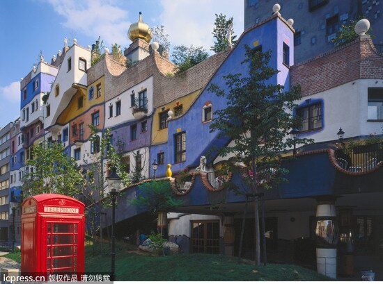 雖然奧地利充滿音樂,卻不只有音樂,維也納的百水公寓(Hundertwasserhaus Wien),真的值得走一遭。百水公寓的正式全名是「維也納的韓德特瓦塞之屋」,是奧地利正處在後現代主義時代,維也納市政府委請一位非建築科班出身的畫家、韓德特瓦塞(Friedensreich Hundertwasser)來設計國宅。於是,畫家充當起國宅建築師,1977年開始設計,直到1983年發包動工,直到1986,這座後現代風格公寓才終於竣工。