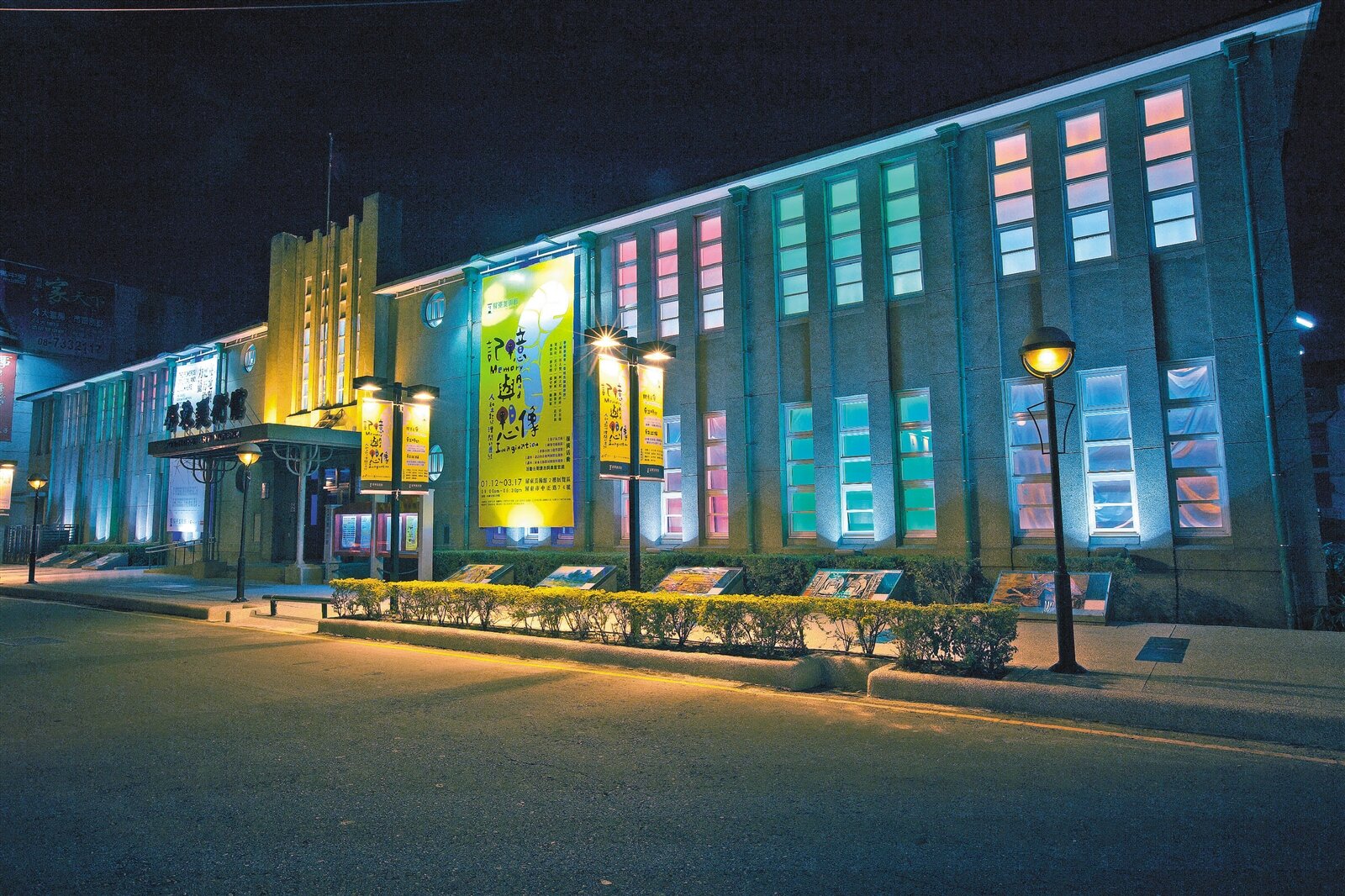 屏東美術館入夜之後,在五彩的燈光投射下,十分吸睛,可惜夜間未開放。(記者翁禎霞/攝影)
