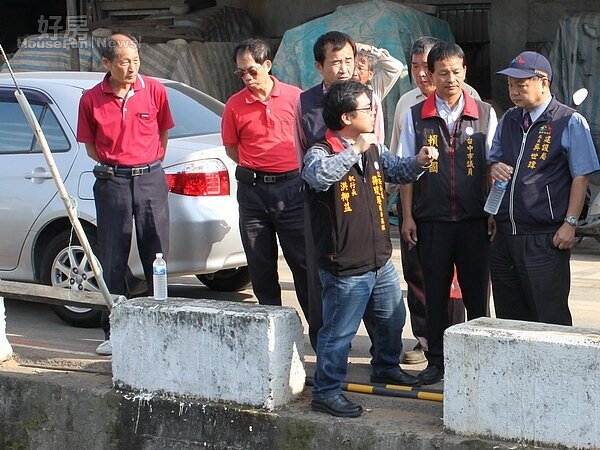 潭子區大富里潭富路三段一處瓶頸路段,影響行車安全,市府建設局吳世偉局長(右一)現場會勘應允拓寬改善。(記者黃玉鼎攝)