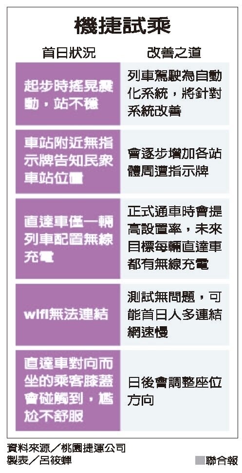 機場捷運昨首日試營運,乘客反應不一,有人大讚「真快速」,但有人說「搖晃厲害」,還出現WIFI失聯、充電座失靈狀況。桃捷公司表示,目前只是試營運,會廣納民眾意見,讓服務提升至百分百。