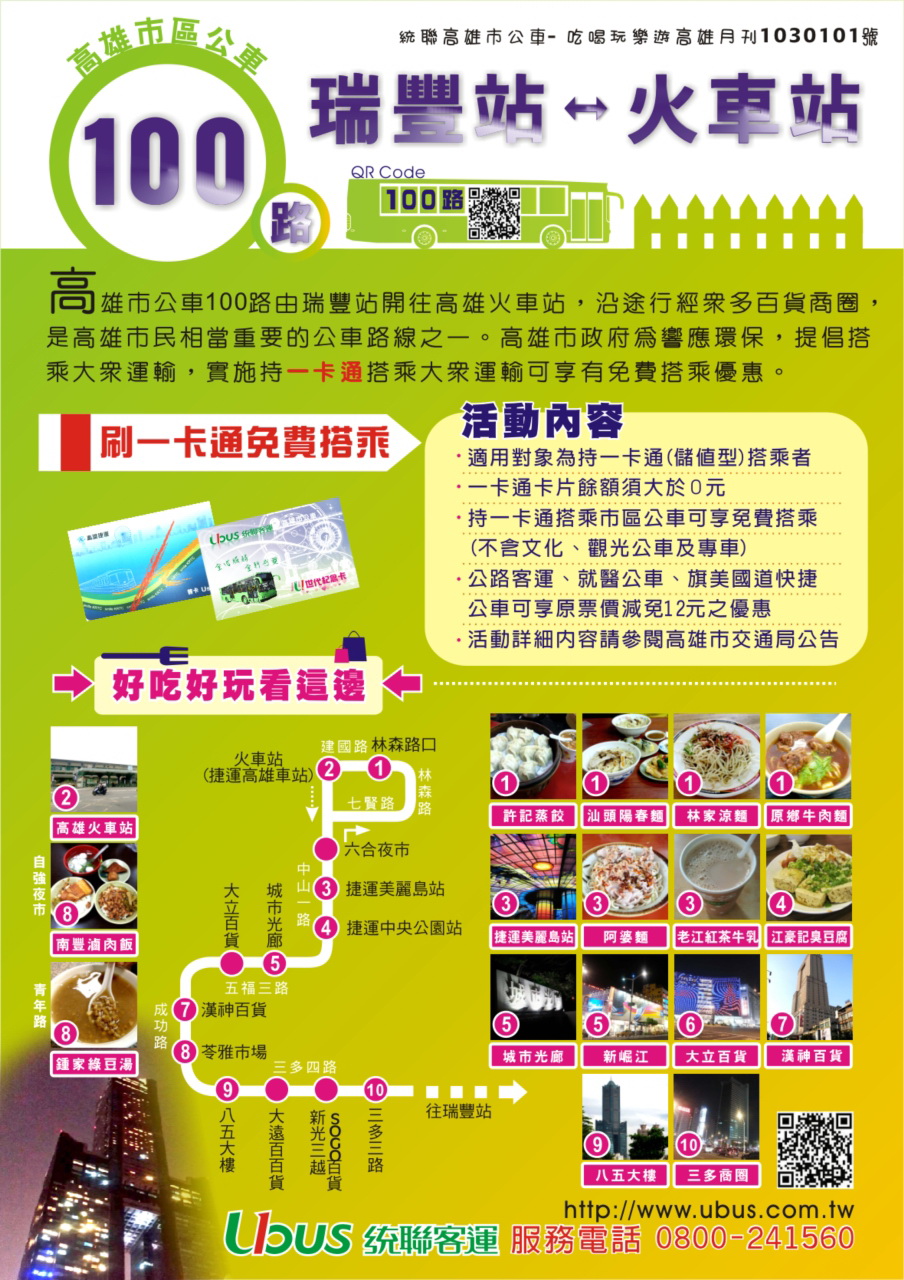 配合民眾持一卡通可免費搭乘市區公車活動,將延續至今年6月底止,高雄市100路公車貼心推出「旅遊專刊」,內容介紹沿線景點與美食,民眾可於統聯客運建國站及100路公車上,索取公車旅遊專刊,按圖索冀,樂遊高雄趴趴go!