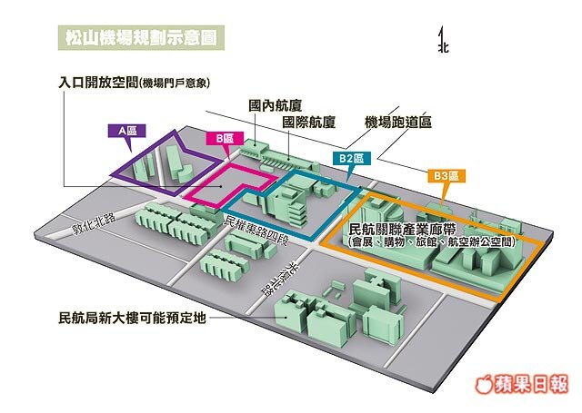 A區為松山機場西側區塊,交通部民用航空局場站組組長范孝倫表示,該地目前為隸屬於台北市政府的苗圃和水利會的抽水站。民權東路三段以北,敦化北路以西區塊,多為7層樓以下的老舊國宅、軍眷,軍方將配合釋出土地,並與內政部營建署城鄉發展分署合作,將該區塊都更重建。松山機場也將拓寬原有道路,並新開連接至民族東路的聯外道路,以解決目前大客車出入問題。