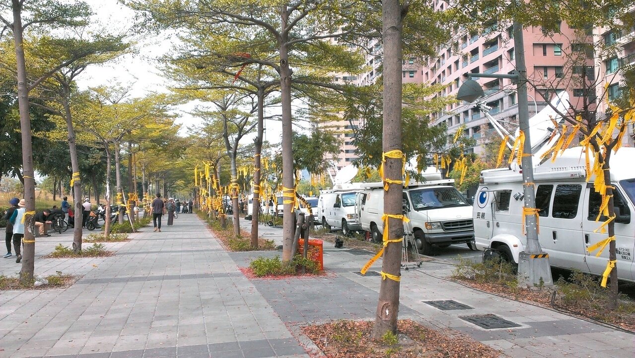 昨人文首璽外的行道樹上,仍飄著滿滿的黃絲帶,但人潮已明顯散去,整天只見零星聚集數十名支持者,或路過民眾好奇抬頭望向扁家。不過各家媒體仍紛紛進駐人文首璽對面的高美館公園,人行步道旁停滿採訪車,緊盯扁家一舉一動。