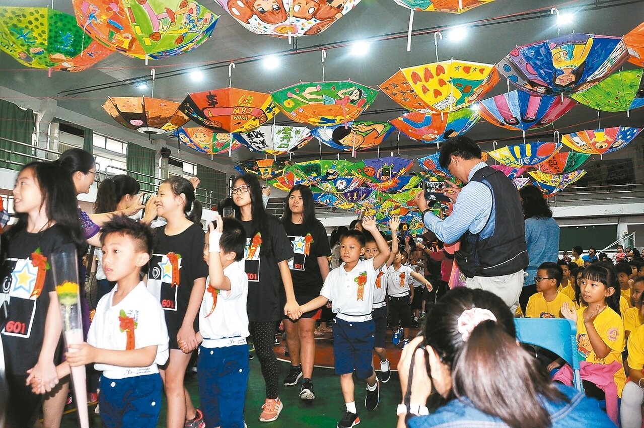 金湖國小今年畢業典禮很不一樣!畢業生走過自己彩繪的繽紛「雨傘大道」進入典禮會場,在象徵「揚傘起飛」氣氛中,留下六年來在校永恆的回憶。