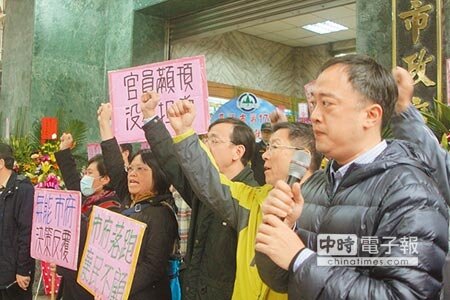 基隆市府前昨擺滿了祝賀新市長上任花架,洋溢辦喜事歡樂氛圍,受邀觀禮的賓客陸續抵達市府,但「暖暖要幸福聯盟成員」昨天則前往市府前抗議,高舉「官員顢頇、沒有擔當」等抗議牌,格外引人側目。