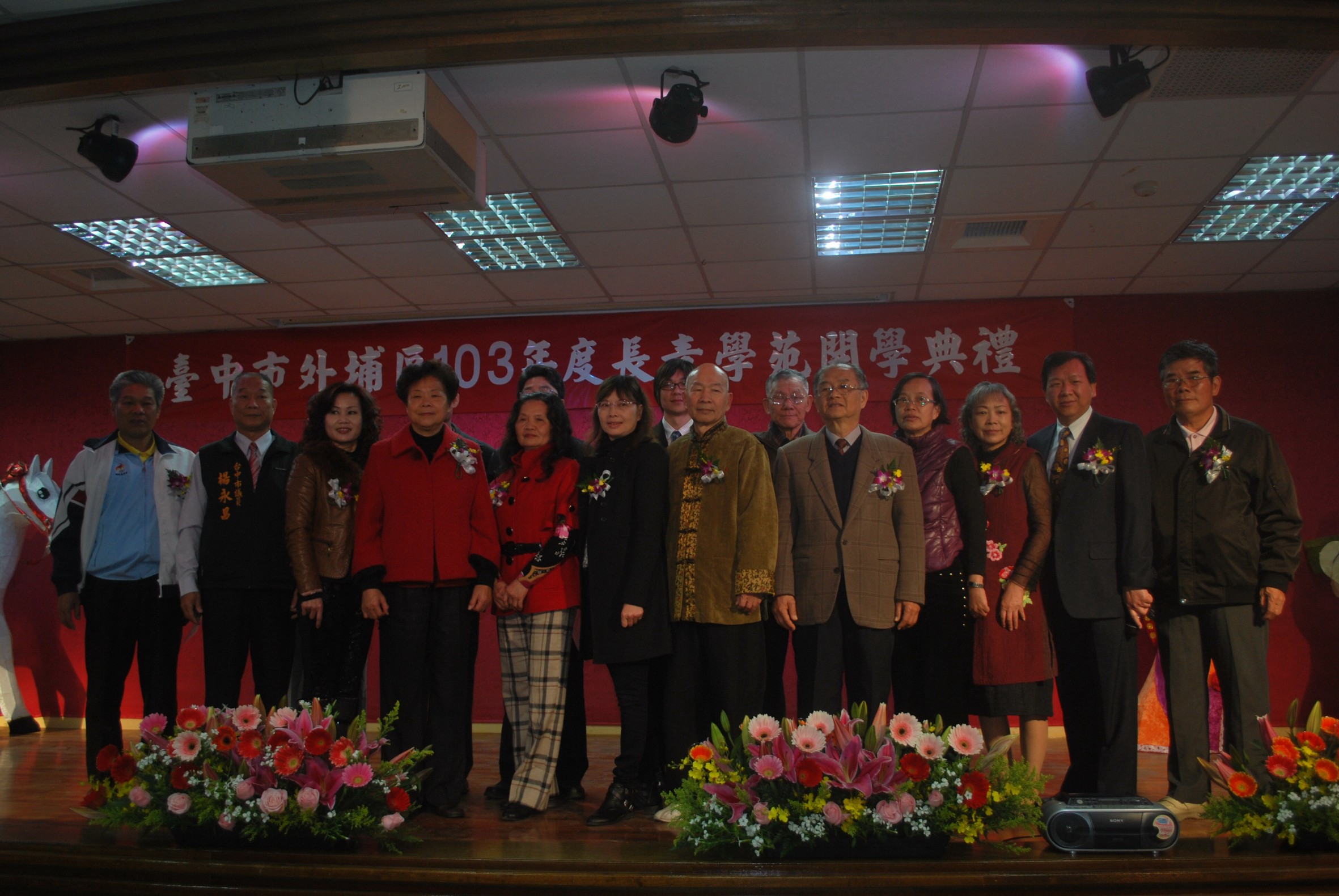 台中市外埔區青長學苑三日假長青活中心舉辦103年度學員開業典禮,有八百餘名阿公、阿婆學員參加,區長劉陳吻與全體教師合照,鼓勵多為老人家費心,贏得不少熱烈掌聲。