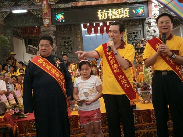 「2012彰化縣媽祖遶境祈福」活動7日自員林鎮中山路的福寧宮起駕,來自全縣12間宮廟的媽祖神尊,開啟遶境行程,鑾駕中午於社頭鄉枋橋頭天門宮駐駕,總統馬英九中午到場參加社頭枋橋頭天門宮祝香典禮。