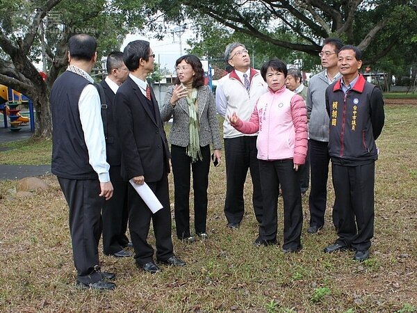 立委楊瓊瓔(右三)、市議員賴朝國(右一)邀集教育部國教署及市府教育局官員,到新興國小校園勘查。(記者李智誠攝)