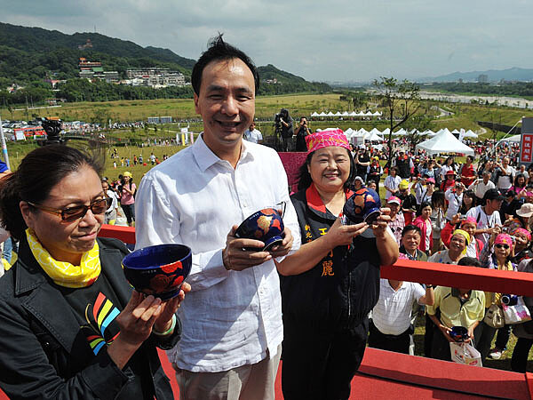 圖/市長朱立倫、客家事務局長彭惠圓及議員王明麗等出席彩繪客家碗活動。(記者黃村杉攝)