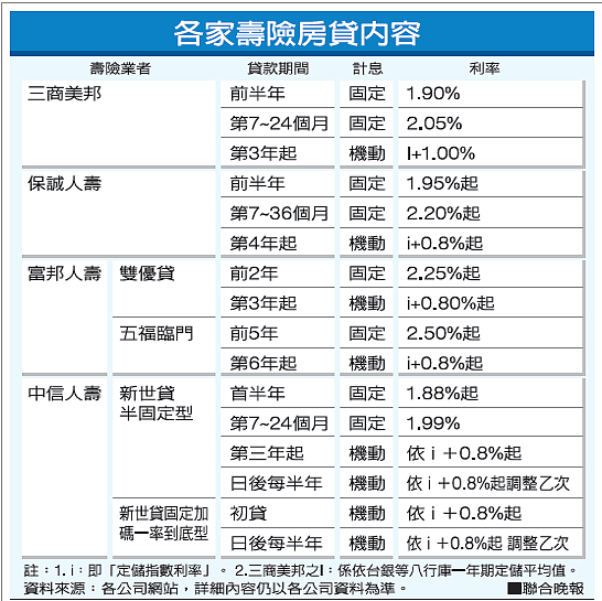 目前多家保險公司都推出前半年利率1.88~1.9%左右的優惠方案,民眾可依資金狀況,選擇最適合自己的房貸方案,達到輕鬆理財的目的。(擷取自/聯合報)
