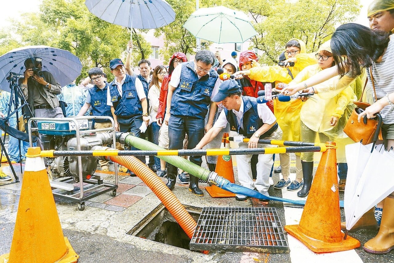柯市府上任後首場颱風考驗,柯文哲昨到興隆、福興路口,看水利處人員操作抽水機,僅停留約10分鐘便離去。