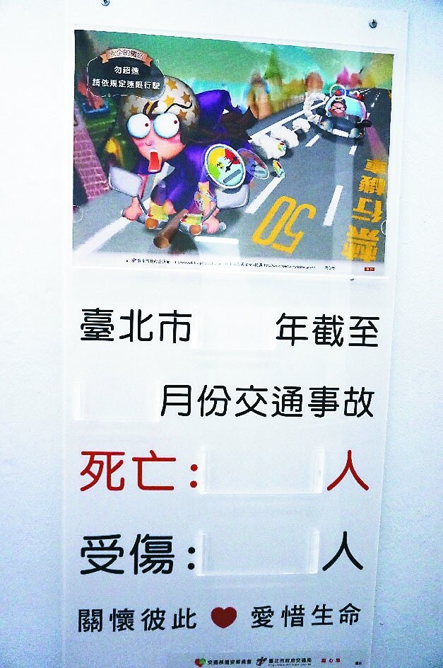 宣導看板寫著,「台北市○○○年截至○○月份交通事故死亡:○人受傷:○人」,「○處」將由字板填上最新數字。交通局本周三就會把數字填上,每月定期更新;而北市截至六月,今年交通事故累計死亡已35人,受傷更多達1萬3650人。