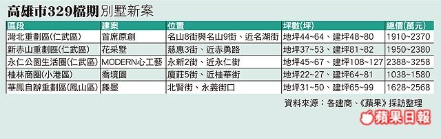高雄市代銷公會理事長戴嘉聖表示,今年329檔期別墅推案量較去年同期更多,總銷也超越去年30億元水準,推案集中在仁武、鳳山及小港等區,規劃走向大地坪、大面寬的換屋型別墅,主力總價多在1500~2500萬元,且多位於新開發重劃區,如仁武區的灣北、赤山重劃區及鳳山區的華鳳自辦重劃區。