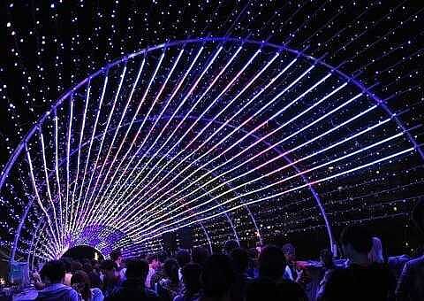 平日供民眾漫步騎自行車的愛河鐵道橋,以最新的「隧道光管藝術」打造成全台首見的「Dios Mio驚奇聲光劇場」,成為今年高雄燈會藝術節最吸晴的焦點,讓高雄燈會不只有天上閃耀的煙火,走過星光隧道,一身的光亮就在身上閃爍,夜間分外漂亮。