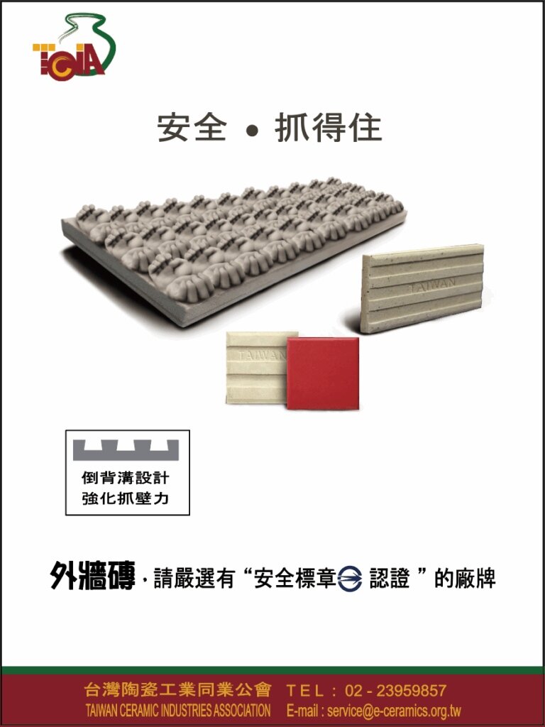 台灣的磁磚外牆施工與產品品質有嚴格把關,國產磁磚需符合 CNS 國家標準,並通過經濟部標準檢驗局「安全標章」認證。這些產品大多採用底部「倒勾背溝」設計,能大幅增強接著劑的抓附力,提升磁磚與牆面的黏著強度。這樣的設計與專業施工結合,不僅加強外牆的耐候性,更保障住戶行走於建築物周邊時的安全。