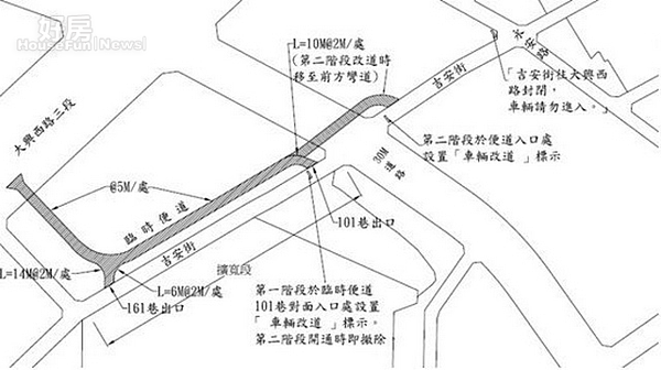 另大興西路同樣因工程施工需求近期將採南北側局部改道之交通管制措施。工務局籲請用路人體諒,並請行經施工區域車輛特別注意車道動線之調整變化,遵照改道後之標誌、標線指示減速慢行,以確保行車安全。