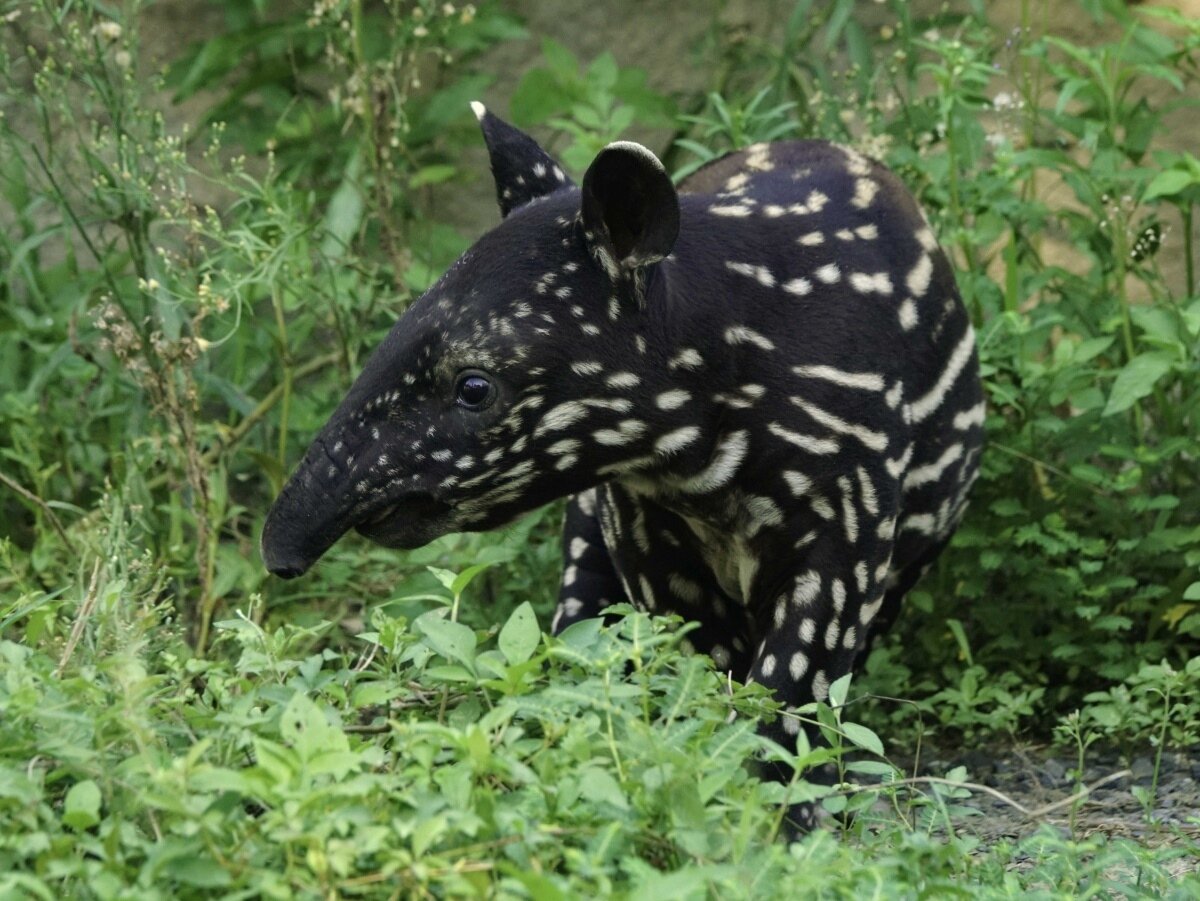 住在臺北市立動物園穿山甲館戶外區的馬來貘寶寶「貘花豆」滿40天大了,小傢伙的體重從出生時的5.6公斤,快速成長到21公斤,目前全身布滿斑點及條紋的毛色超級可愛,隨著年齡增長,外觀將在6個月大時,蛻變成馬來貘黑白配的專屬樣貌。