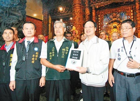 擁有一六○年歷史、供奉輔信王公的大園竹圍信仰中心福海宮,因位於桃園航空城第一期計畫拆遷範圍,面臨被拆除命運。信眾卅日趁行政院副院長江宜樺訪視時遞交陳情書,希望政府尊重宗教信仰暫緩拆除。