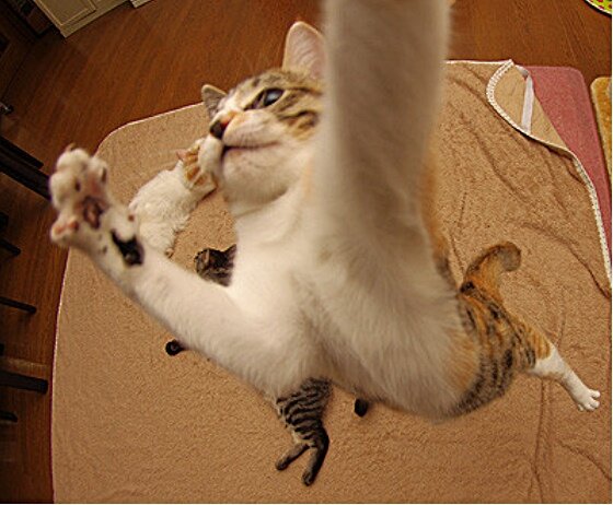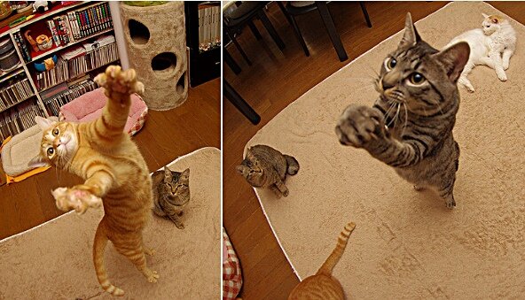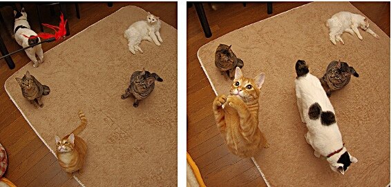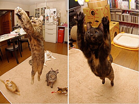 日本人氣部落格「我家的貓~年糕與長崎蛋糕」紀錄家裡九隻貓的熱鬧生活,去年其中兩隻貓咪「茶丸」及「黑豆」,自從做了絕育手術後發福不少,其他隻貓也沒有特別苗條,都缺乏運動,因此飼主Kachimo 決定開始替牠們做體能集訓。拿起逗貓棒,所有貓咪注意力集中,為了捕捉「獵物」,貓咪們一隻隻奮力飛撲,達到肌肉伸展運動的目地。