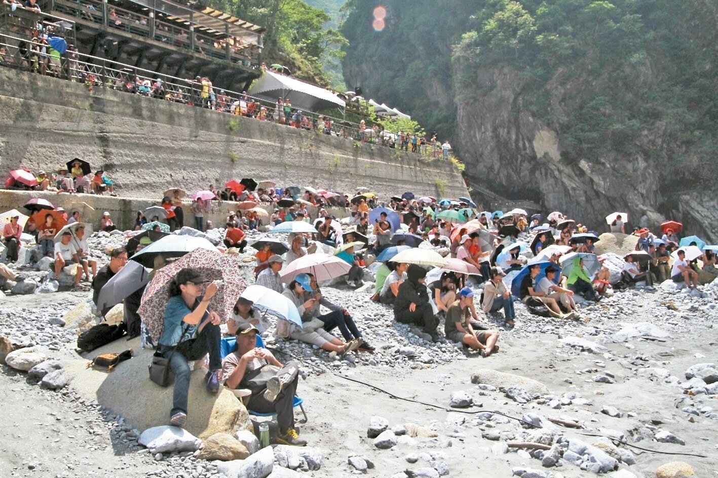 太魯閣峽谷音樂節昨天在長春祠下方的立霧溪谷登場,數百名來自各地的民眾在大自然環繞下,坐在溪畔聆聽音樂家現場演奏。