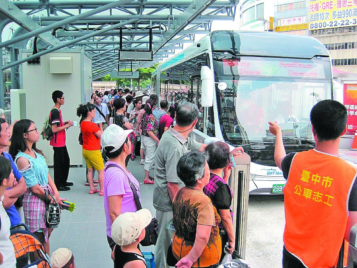 聯合報前天報導,台中火車站前BRT車站,乘車資訊太小,殘障人士搭輪椅上車不便;昨記者再前往,現場有3名工作人員協助,向乘客說明乘車資訊,車上也有專人發公車傳單。