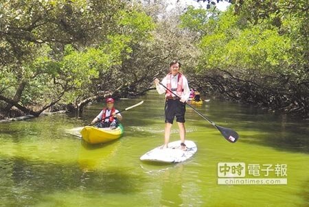 綠色觀光2014台南獨木舟節昨天開跑,觀光旅遊局長陳俊安(右)在四草大眾廟親自上場體驗。(記者黃文博攝)