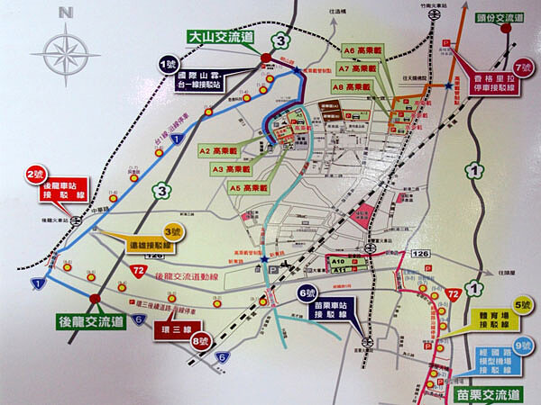 8條免費接駁專車,10月10日國慶日當天下午3時至晚上12時,其餘活動期間從下午4時至晚上11時,平均10至15分鐘1班車次,搭載鄉親及遊客前往活動現場。免費接駁專車路線包括:1號國際山霖停車場─豐富八街左側,2號後龍車站─新港三路與豐富八街,3號遠雄停車場(台1線與126線)─新港三路與豐富八街,5號縣立體育場─新港三路高鐵旁,6號苗栗火車站前中油探採部─高鐵一路與新港二路,7號香格里拉─新港三路高鐵旁,8號新港大橋苗栗端下方環三後續道路─新港三路與豐富八街,9號經國路模型飛機場─新港三路高鐵旁。
