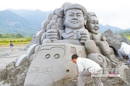 沙雕團隊設計師傅葉坤定說,這次受富里鄉農會之邀前來參與活動,設計了傅崐萁夫婦沙雕;這是他首度雕塑政治人物,為了捕抓其神韻,還特地參照2人諸多照片,花費10天才製作完成,成果還算不錯,作品讓人感覺很親民很可愛。