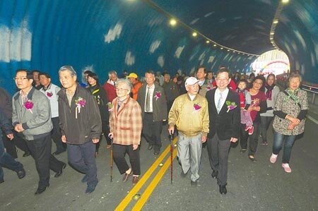 南投縣魚池鄉6號道路暨東池隧道開通,地方首長(照片最左者為李朝卿)陪著耆老徒步穿過隧道,慶祝此魚池鄉及九族文化村最重要交通孔道,正式開通。(記者沈揮勝/攝影)