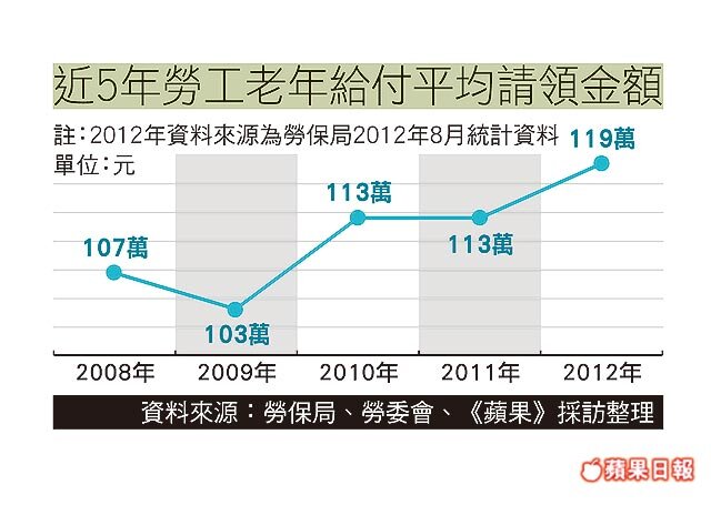 勞保10月中旬傳出15年後即將破產消息,許多退休族擔心未來領不到勞保老年給付,紛紛提前申請,請領人數大幅增加6成,希望能提早落袋為安,根據勞保局2012年8月統計資料顯示,今年每位60歲以上退休族請領老年給付,平均可領約119萬元,若選擇按月領取老年年金,每月平均約可領1.4萬元。