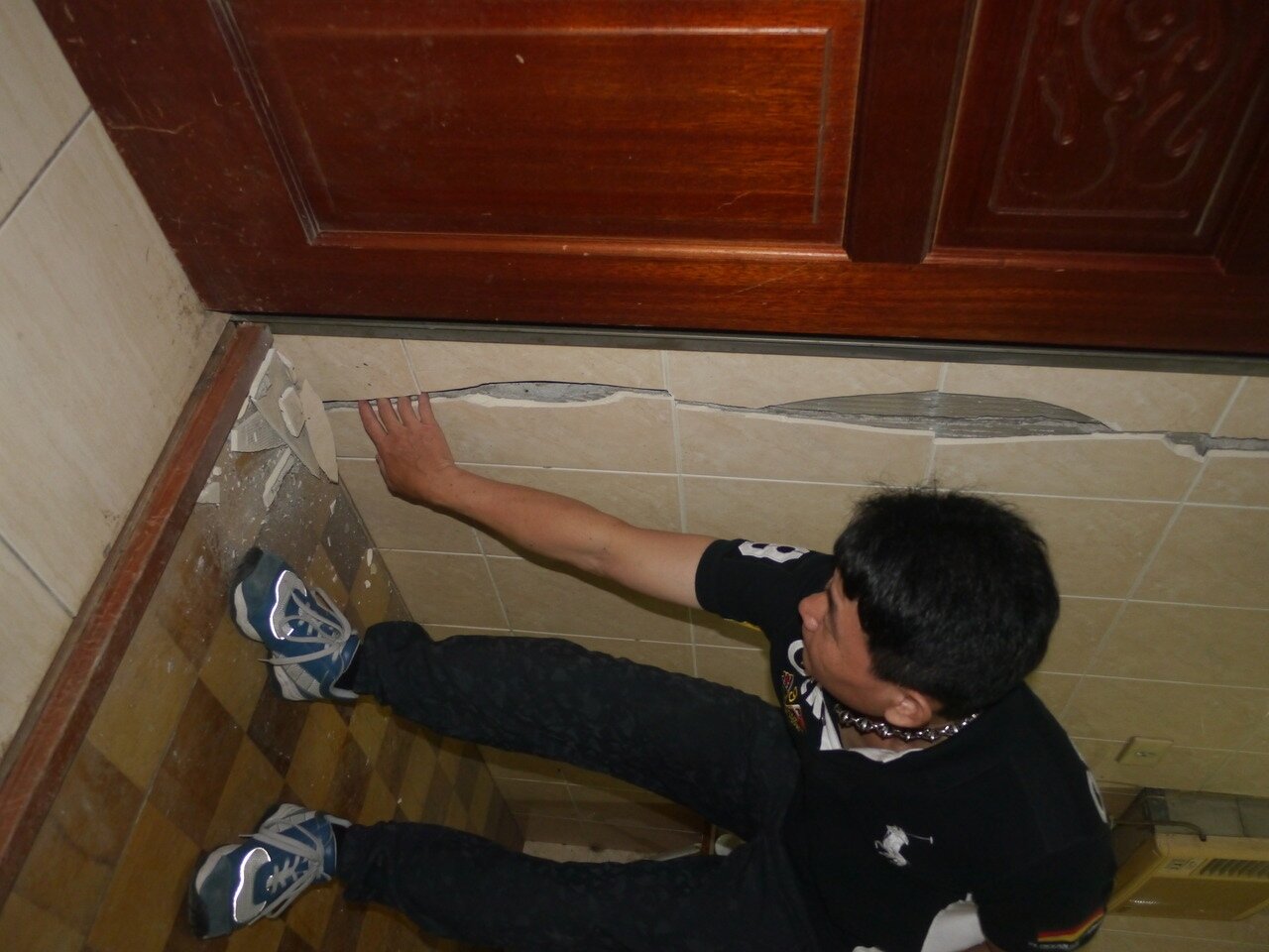 除噪音擾人外,緊鄰工地的房子地面與牆壁出現龜裂,裂縫大到整個手掌可以放進去。劉姓住戶說,2020年建地開工後十分吵雜,更誇張的是,自家房子與隔壁住屋接縫處出現裂縫,前棟與後棟地面顯著落差,聘請土木技師公會人員到府檢測,地層下陷達15公分深,工地人員態度高傲,沒有誠意解決問題。