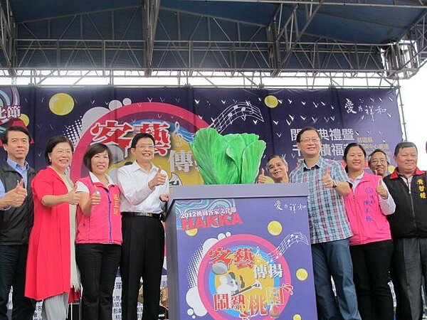 以傳承客家傳統文化為主軸的「2012桃園客家文化節」,6日於展演中心廣場正式登場,在熱鬧的客家舞獅及客家合唱、舞蹈表演下揭開活動的序幕,現場並齊聚了2,000多名年輕的鄉親共同體驗製作積福菜的傳統活動,代表客家文化能夠代代相傳,意義非凡。