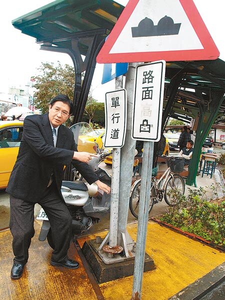 實在有夠扯!宜蘭火車站前廣場「路面顛簸」警告標誌,損壞多時還被惡搞塗鴉,圖示凸起處遭補兩點,引人遐想,且「路面顛簸」圖示,卻誤植成「路面高凸」,民眾直呼「誇張!」縣府工旅處九日據報已將標誌拆除。