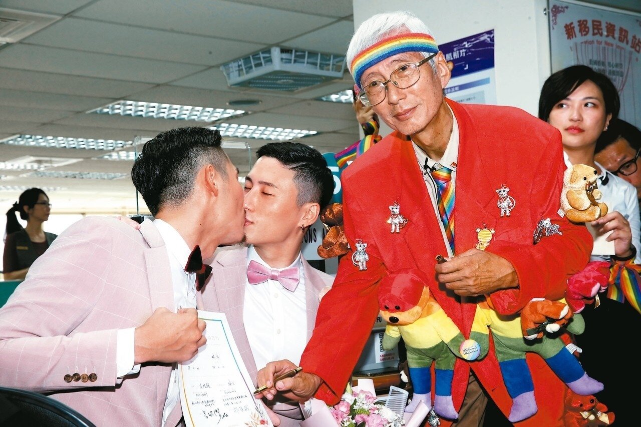 推動同婚卅三年的資深同運人士祁家威(右二)為曾在蔡健雅演唱會上求婚的男同志伴侶小銘和小玄證婚。 記者徐兆玄/攝影