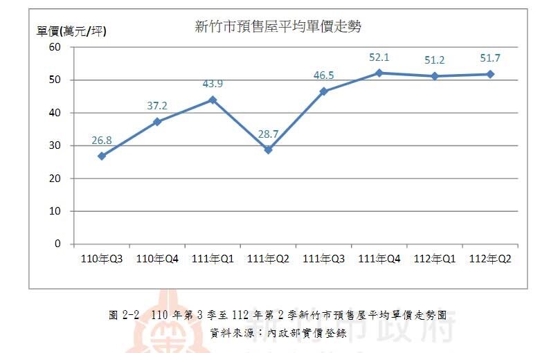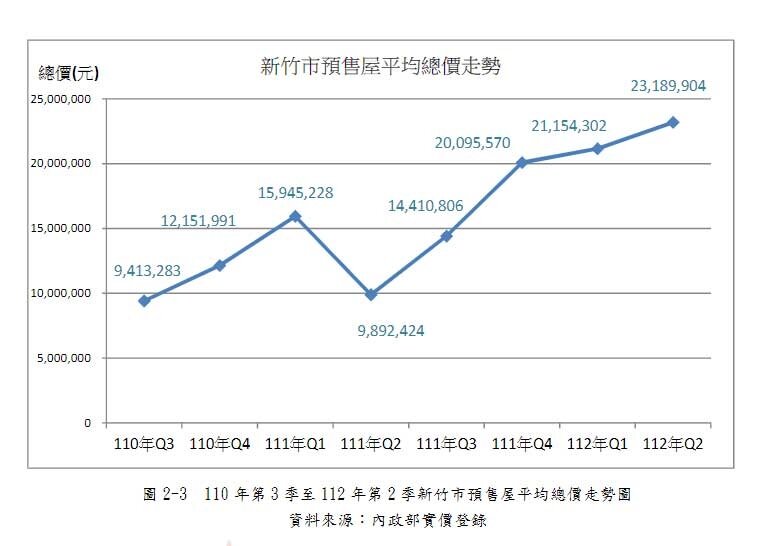 新竹市地政處日前公布今年Q2房地產住宅市場分析報告,統計顯示買賣登記移轉棟數雖較前季下降,然新竹市房價持續攀升。此外,預售屋實價登錄戶數470戶,創8季以來新高;與2021年Q3相較,預售屋成交均價上升92.91%,來到每坪51.7萬元,成交總價更大漲逾140%,從每戶約940萬元攀升至2,320萬元。