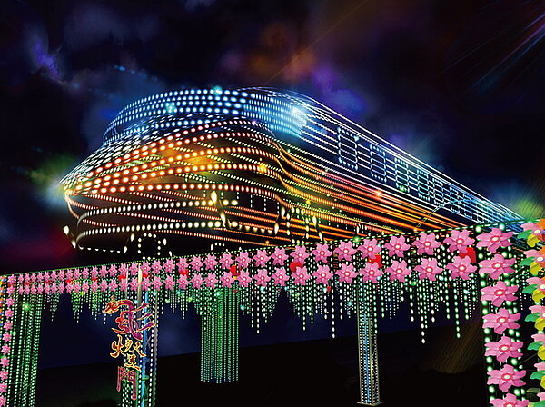 交通部所設置的3大迎賓門中,「迎春門」是運用「春」字四面皆平衡的美感,打造出極具特色的大紅迎春門,以璀燦光影,迎接遊客的到來;「晶采門」是以光束流線,表現數大便是美的亮麗光彩,走過晶采門能充分體會燈會的炫麗光華,「飛騰門」則別出心裁,以大小層次不同的入口,推疊出彷彿任意門的空間感。