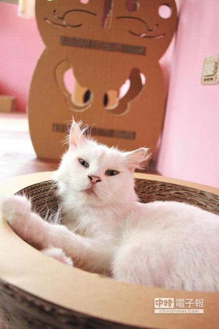 流浪貓的小確幸!台中市動物之家將收容用的貓屋改頭換面,模擬人類家庭環境,打造「粉紅城堡」及「湛藍王座」2間5星級貓屋,流浪貓可在紙箱製的睡盆(見圖,盧金足攝)、貓咪太妃椅、體操跳台等空間活動,來認養的民眾觀察貓咪在家行為零距離,快速與新主人建立信任關係。