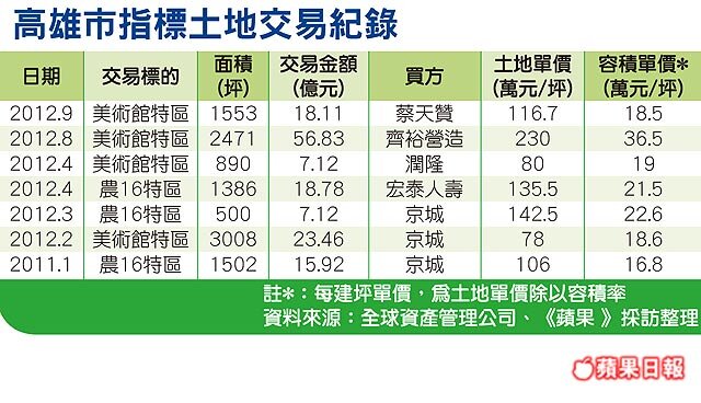 高雄市政府昨天標售土地獲佳績,最受矚目的是京城建設董事長蔡天贊加價47%、總價18.1億元買下美術館區千坪地,換算每坪買價116.7萬元。蔡天贊上月底才以每坪230萬「天價」脫手相鄰的土地,昨日他出手引發學者質疑蔡意在炒作。