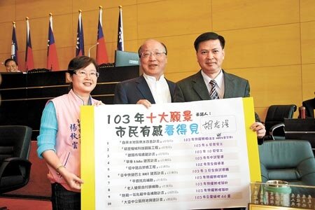 市議員楊秋雲(左起)、林汝洲要求市長胡志強簽署市政10大願景,承諾明年全力實現。(記者盧金足/攝影)
