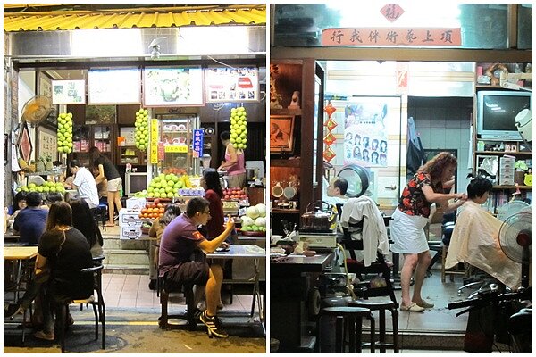 ↓泰成水果店的老顧客吃水果話家常(左)。 迷人的正興街生活圈,理髮店與雕刻師就是「歲月」(右)