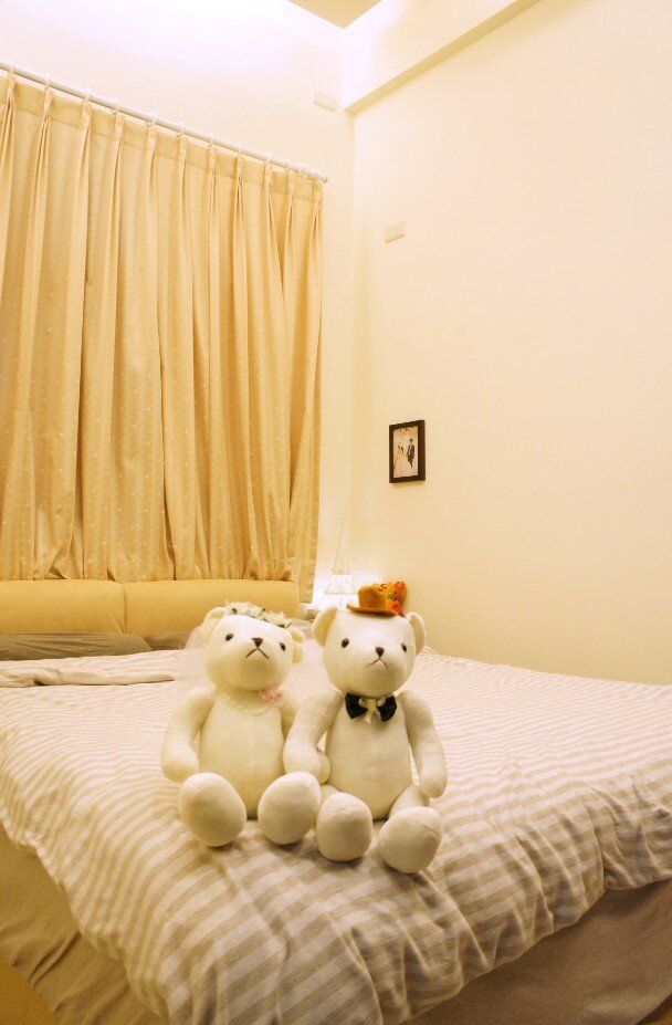 兩房一廳一衛浴的基本格局已足夠讓幸福的兩人居住,兩房為主臥與書房,主臥室打造米白色的簡約風格,裝潢時刻意打造了收納性強的落地大片衣櫃,不但延展收納空間,還讓房內的衣物都隱形於牆後,讓氣氛更加簡潔溫馨。