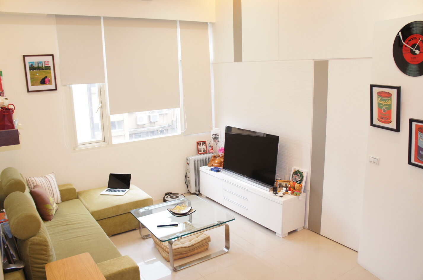 屋齡為15年的電梯華廈,不同於新大樓高公設、高管理費,華廈整體條件更為親民,聰明的小倆口特別挑選已經裝潢基本設備的物件,而且在老華廈中精選挑高達3米6、格局方正、採光極佳,對身高高挑的兩人來說,居住起來舒服又不會有狹窄的壓迫感,屋內裝潢以純白為主底,搭配有活力又沉穩的墨綠色沙發,購入層板DIY自組書架,加上兩人的甜蜜合照相框裝點空間,小資、簡單就讓新婚小宅流露出甜蜜的幸福氣息!