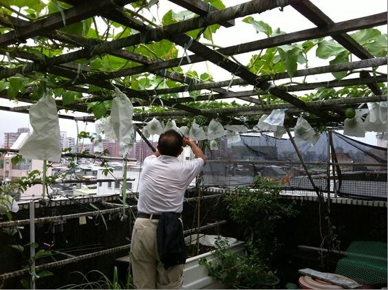 「黎明即起,耕作趣。」我家在台北忠孝東路五段,老公寓的頂樓充滿綠意,蜜蜂和小鳥駐足唱歌。看著爬藤類的絲瓜、百香果、瓠瓜、小黃瓜和秋葵,時不時的出漂亮的花朵或成群的果實櫐櫐,頂樓不再只是冰冷的水泥地,而是充滿生命力的有機生態菜園。