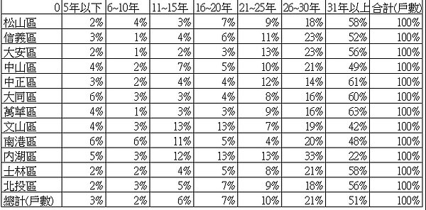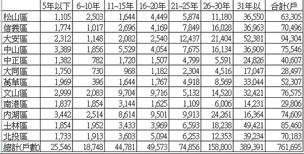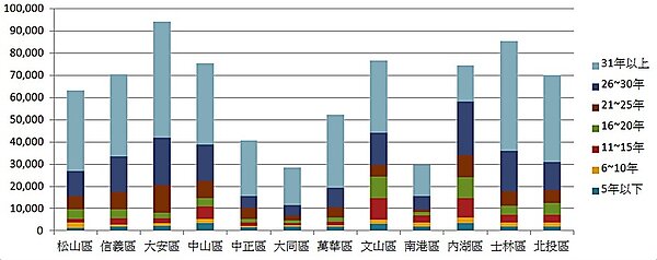 供給面是過去最少被探討的部分。以下三張圖表說明了台北市目前房屋供給的情況,結論就是:台北市屋齡嚴重老化,而且已經到了不處理不行的程度。目前台北市有超過一半的房子屋齡大於三十年,而次多的區塊是26~30年佔了兩成、再其次的是21~25年佔了一成。
