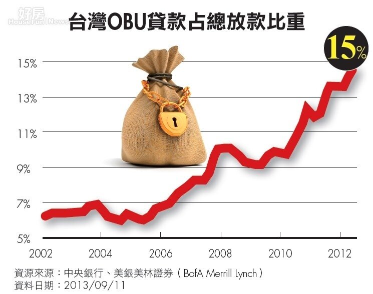 OBU放款在2002年時僅占台灣金融機構總體放款6%,但到去年底已攀升到15%,在台灣本島,企業、政府和消費貸款成長有限,消費貸款在2005年卡債風暴時,年成長率一度飆到15%,除此之外,過去十多年來企業和政府貸款年成長率都沒有超過15%,反觀OBU貸款年增率(扣除本土卡債風暴和全球金融危機當年)都在20%以上。