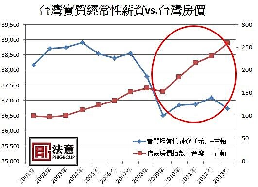 這裡就拿實質經常性薪資來看,2013年前四個月的數字,是自2009年恢復以來最低的數字。為了讓大家更有感覺,一併把代表成屋市場的信義房價指數放進來對比,可以看到:實質薪資往下走,房價指數不斷走高。